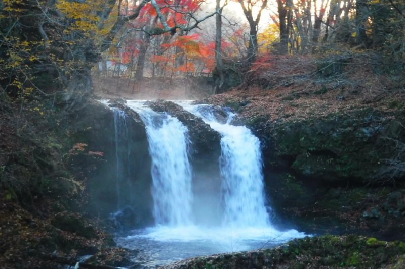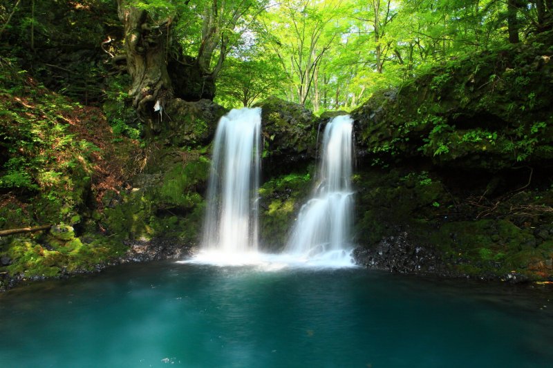 The falls flow from the Katsura river with water from Lake Yamanaka and Oshino Hakkai and rock formations formed by lava from Mt. Fuji. The falls stand 10 meters high, and reflect the lush scenery around it throughout the year. Visitors enjoy the blossoms of mitsuba-tsutsuji (a variety of azalea) in Spring, and vivid Japanese maple leaves in autumn. Tucked away in a hidden alcove, the falls stay cool even in the summer.