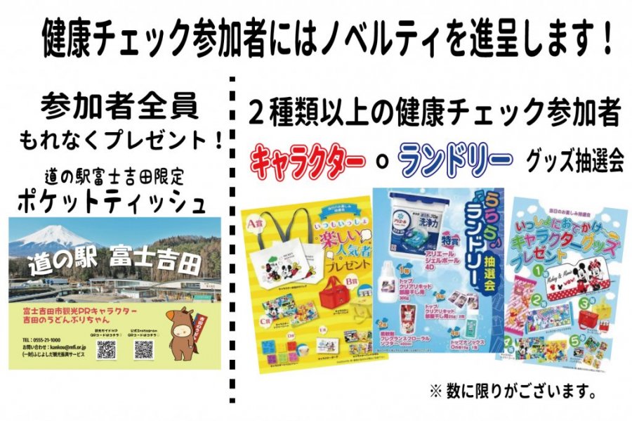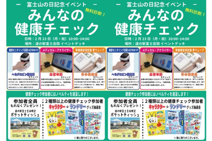 | イベント内容 | 富士山の日記念イベントとして、道の駅富士吉田イベントデッキにて、明治安田「『道の駅』地元の元気プロジェクト」としてみんなの健康チェックを開催いたします。 ■ 体内に酸素を供給する大切な役割を持つヘモグロビンをモニタリングする「ヘモグロビン推定値チェック」 ■ 血管の老化度合い分かりやすく採点で表示する「血管年齢チェック」 ■ 超音波を手首に伝播させ、投下した波の形から骨の強さを算出する「骨の健康度チェック」 の3種類の健康チェックを無料で診断します。 また、健康チェック参加者にはノベルティとして、全員にもれなく道の駅富士吉田限定ポケットティッシュを進呈します。さらに2種類以上の健康チェック参加者には、キャラクター・ランドリーグッズが当たる抽選会に参加できます。グッズにつきましては、数に限りがございます。みなさまの参加をお待ちしております。 |
